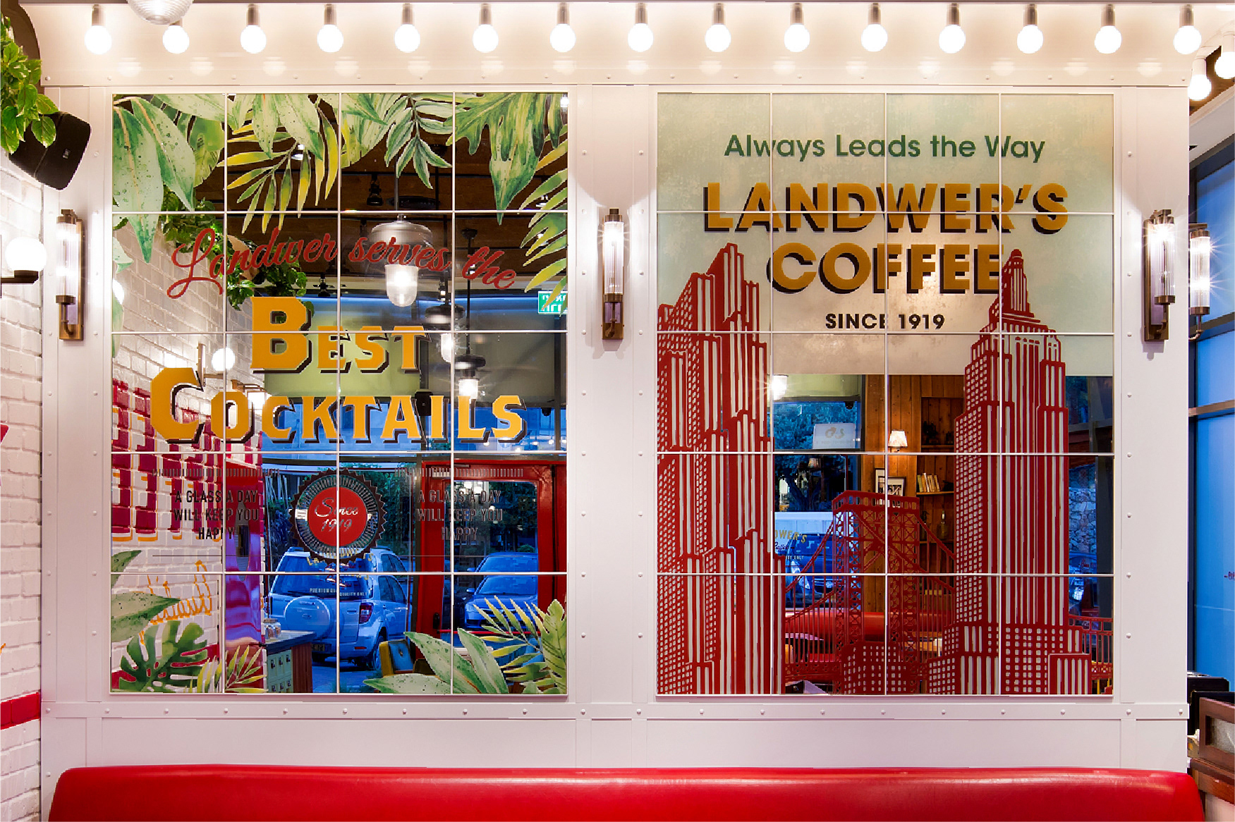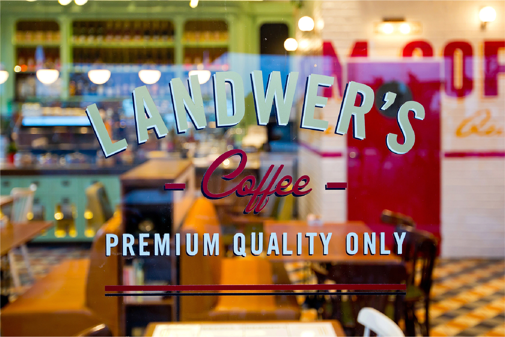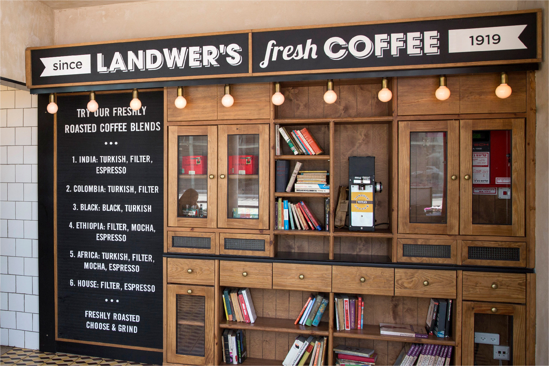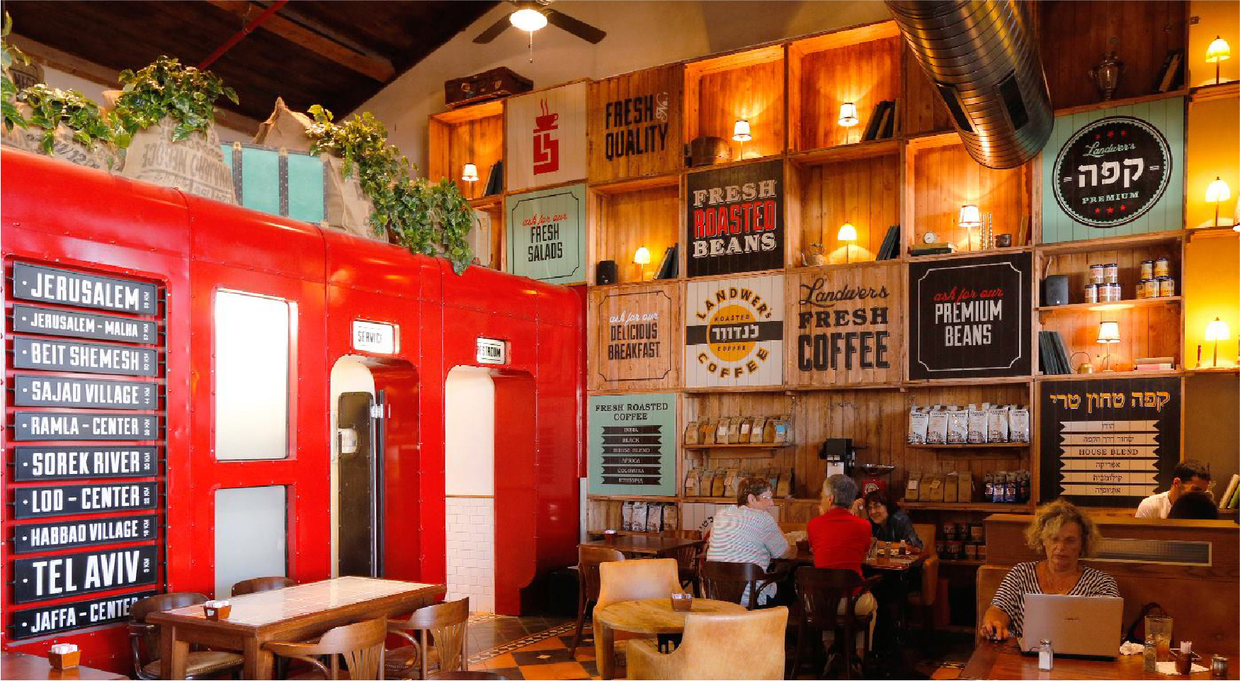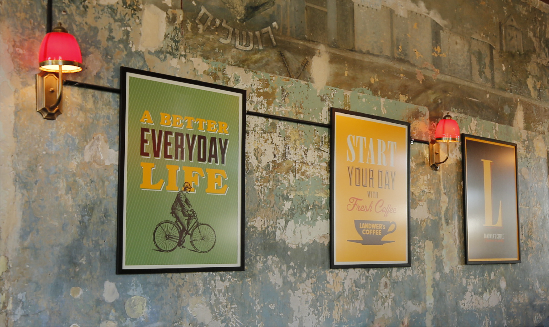 'Landwer's Coffee' shops store branding is spreading over many varied formats: signage, tables, ceramics, mirrors, graphic printed walls, posters, lighting fixtures and much more