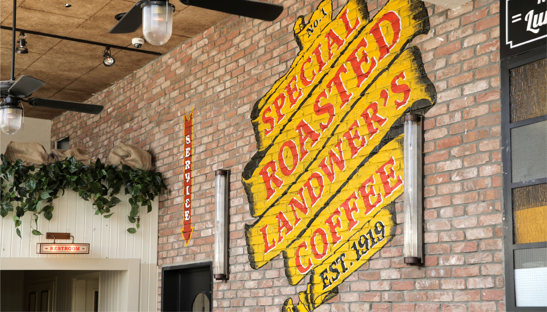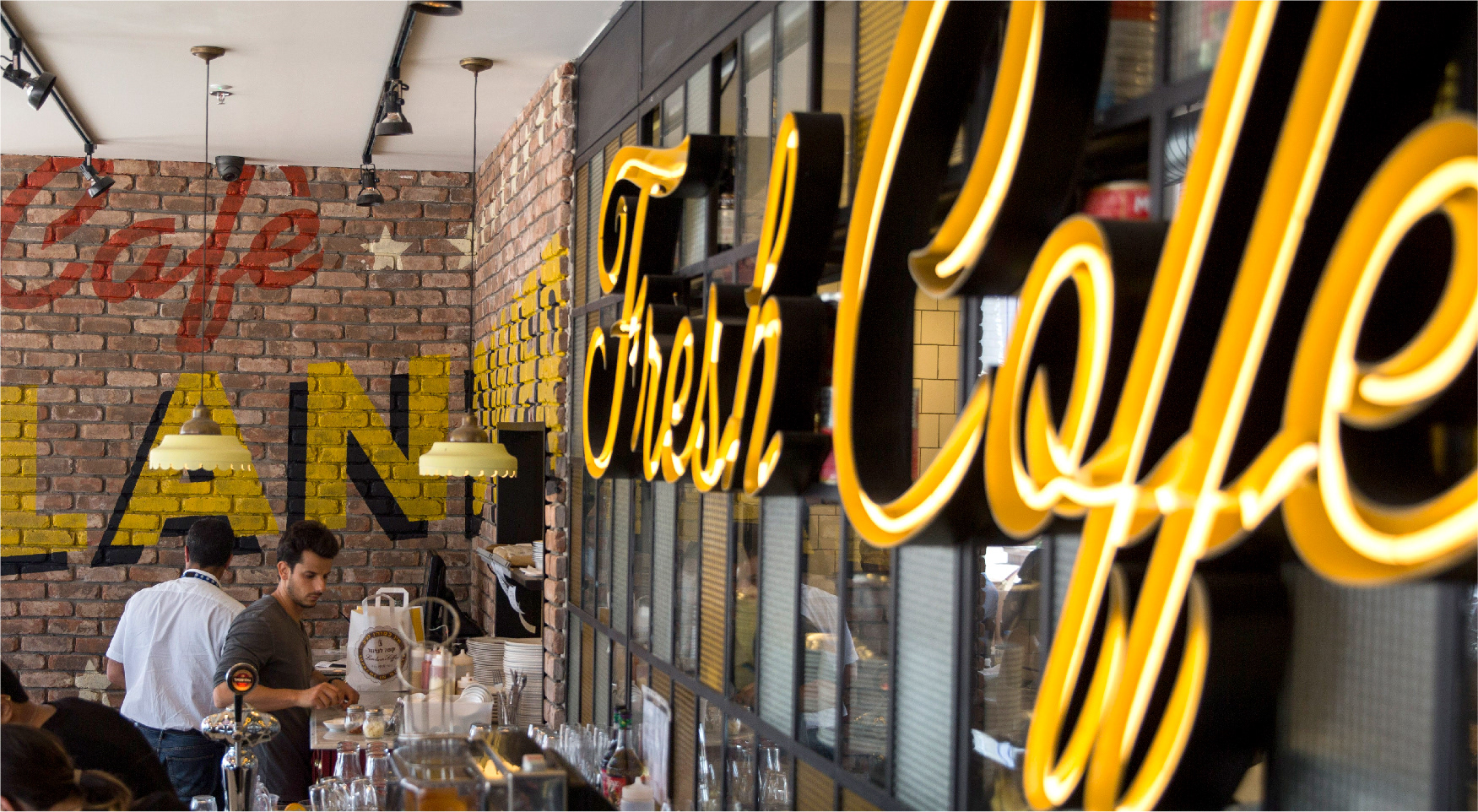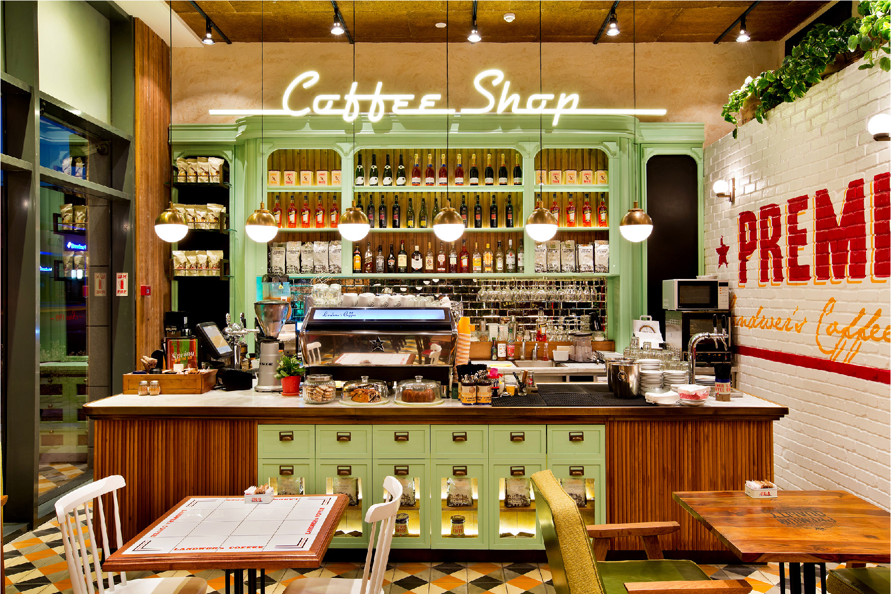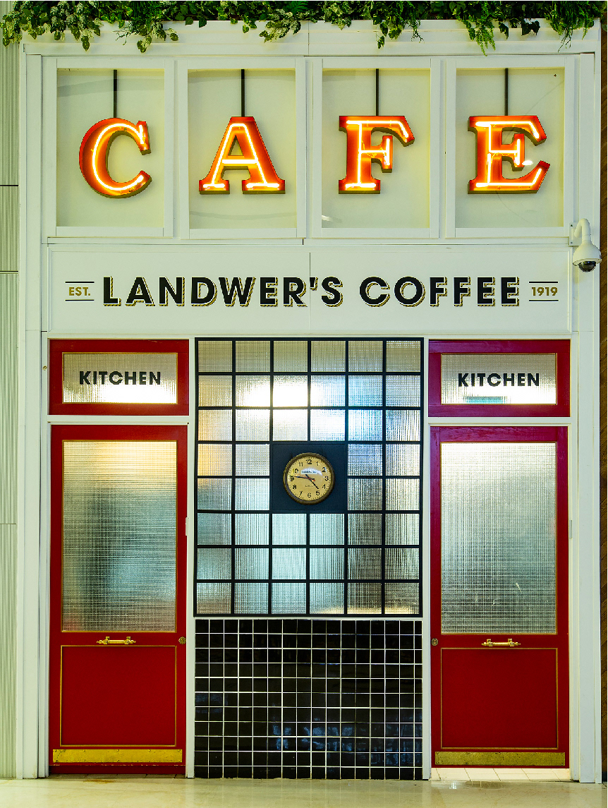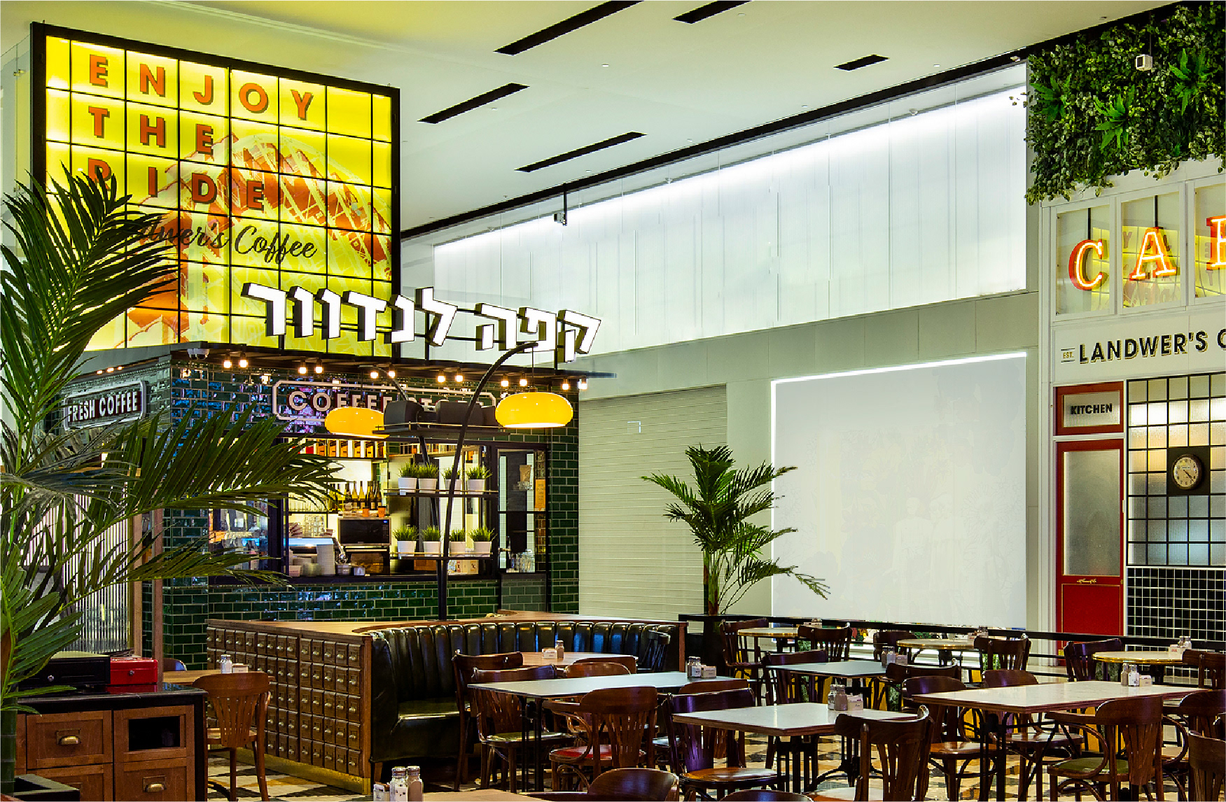 'Landwer's Coffee' shops store branding is spreading over many varied formats: signage, tables, ceramics, mirrors, graphic printed walls, posters, lighting fixtures and much more